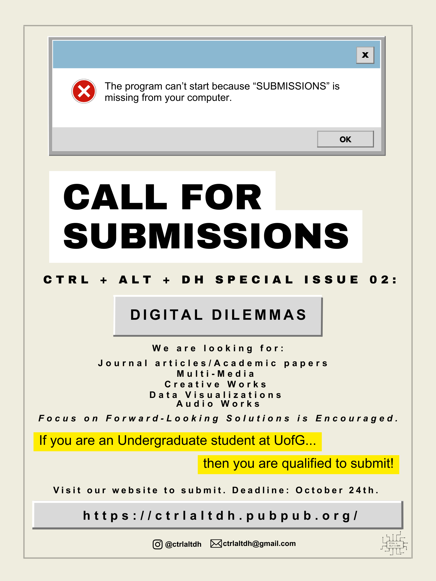 CTRL+ALT+DH is excited to announce a Call for Submissions for our upcoming issue with the theme of Digital Dilemmas. We invite all undergraduate students at the University of Guelph to submit original research, essays, and creative works that explore the complexities, ethical challenges, and unforeseen consequences of digital technologies in the humanities and beyond.