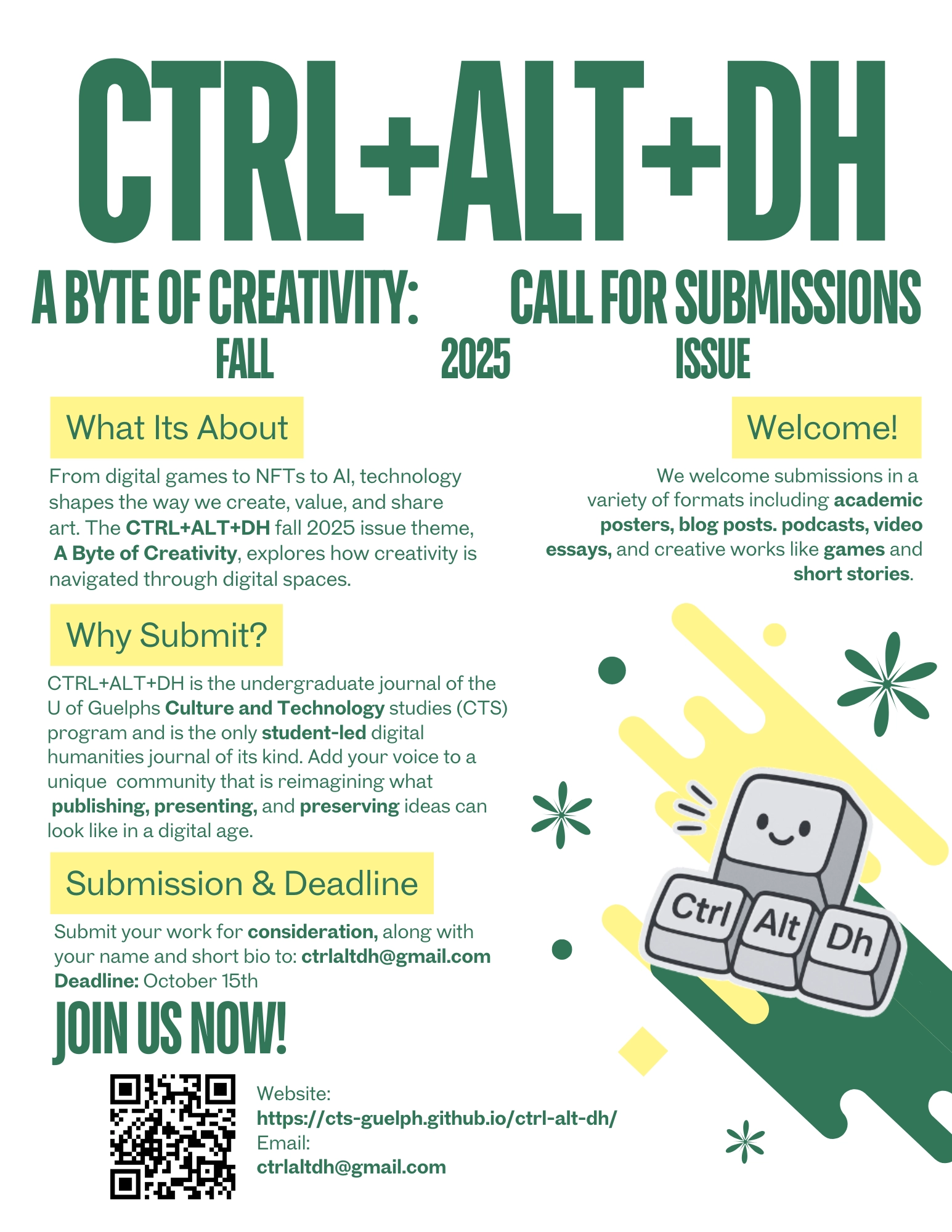 CTRL+ALT+DH isn’t just a journal, it’s a one-of-a-kind, growing experiment in what scholarship and creativity can become when digital and humanistic practices collide. CTRL+ALT+DH is a platform for dialogue, experimentation, and bold creative risks. Each issue is only as vibrant as the voices that fill it, and your contributions help capture how today’s students are navigating and transforming creativity in digital spaces.