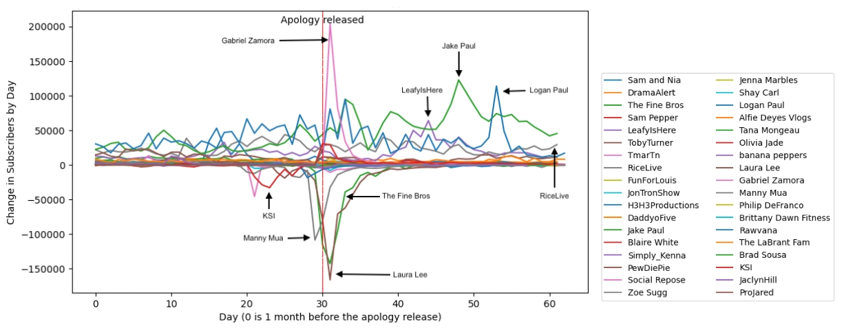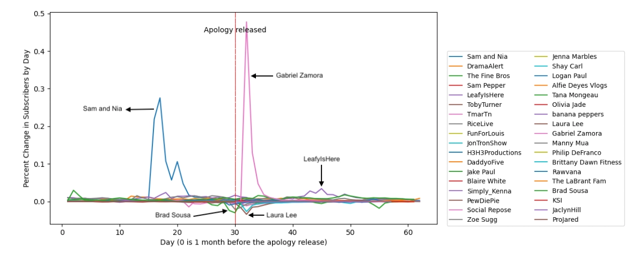 Although the data in Figure 1 were generally in the same range, Figure 2, which plotted the percent change in channel subscribers with respect to the channel’s total subscriber count, had two main outliers: Sam and Nia, and Gabriel Zamora. Zamora nearly doubled his total subscriber count in one day while Sam and Nia saw close to a 30% increase in their subscriber count a few weeks before their apology. This increase was due to a video posted on August 5 announcing Nia’s pregnancy which went viral, along with another video posted on August 8 sharing news of Nia’s miscarriage.22 Although Sam and Nia had the second largest gain in subscribers in percentage change, the actual number of subscribers they gained in one day (53,080) pales in comparison to Gabriel Zamora or Jake Paul’s highest daily subscriber changes (204,116 and 122,845, respectively).
