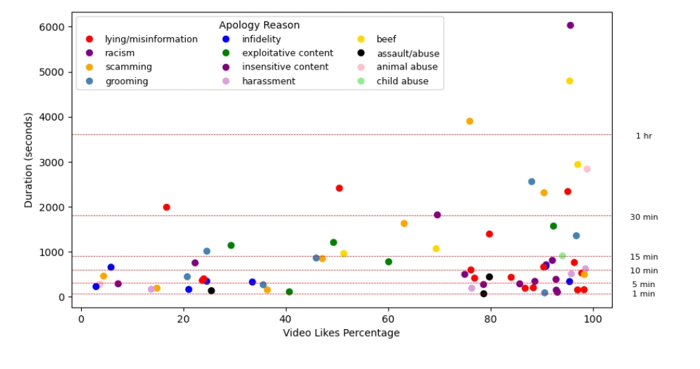 This project ended up very different from where it began. Different obstacles such as the lack of a database and lack of available data forced us to change our approach several times, and we eventually spent most of our time collecting and organizing the data. As a result, we couldn’t perform the analysis that we had wanted. Still, from the data we were able to analyze, there were some interesting trends. For instance, the length of an apology was correlated to its success, perhaps because audiences viewed a longer apology video to be more comprehensive and sincere.
