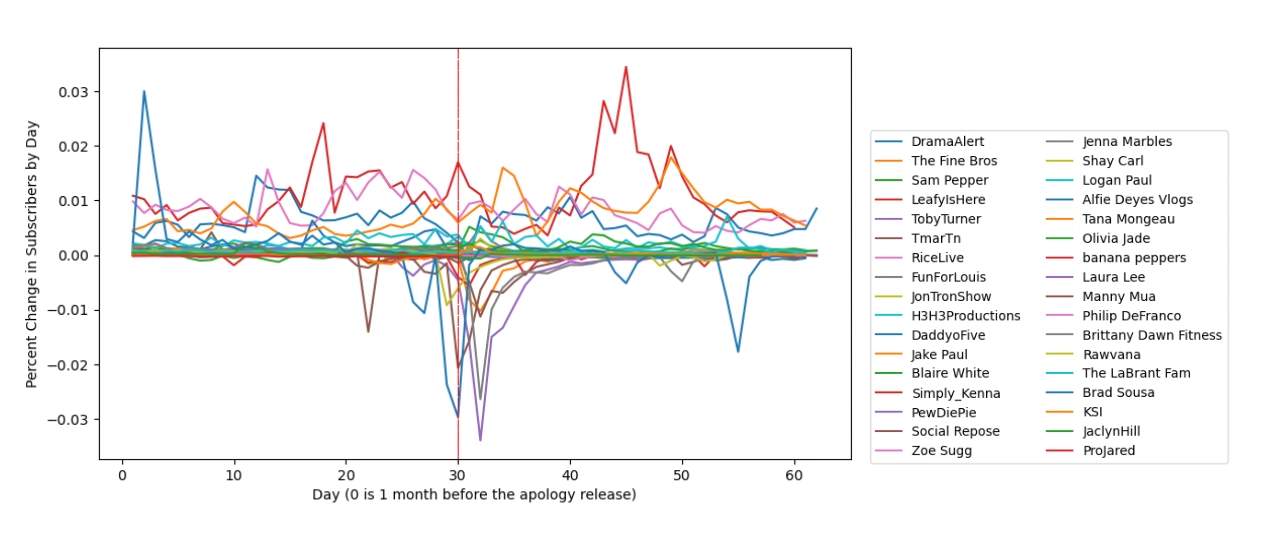 The original purpose of this project was to analyze the impact that these apologies had on public perception and subscriber retention. The creators featured in our project were not affiliated with us in any way and had no impact on the data curation process. They would not see any kind of benefit from our work. On the other hand, these creators have established themselves in positions of power where the impact of their words and actions is worthy of scrutiny.