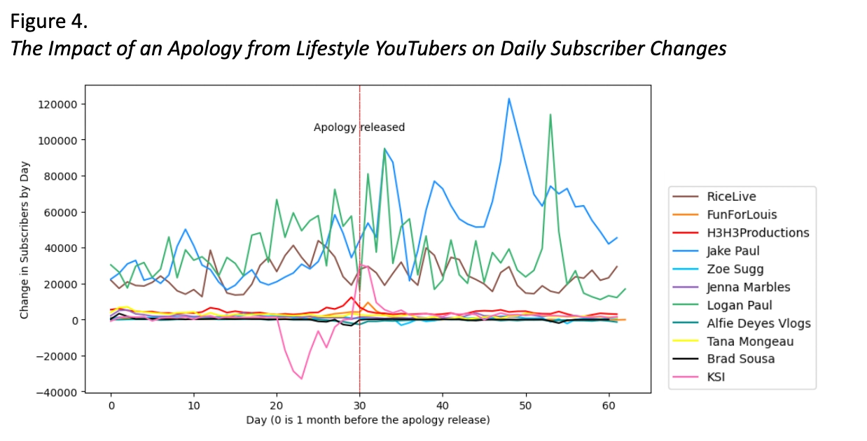 We then decided to do an in-depth case study of a single creator who has been associated with multiple controversies so that we could better identify the effects of their apology. Focusing on a creator like Logan Paul who has been perceived as both hero and villain (multiple times) would act like a control—it would be possible to see what specifically about the apologies and scandals were different each time.