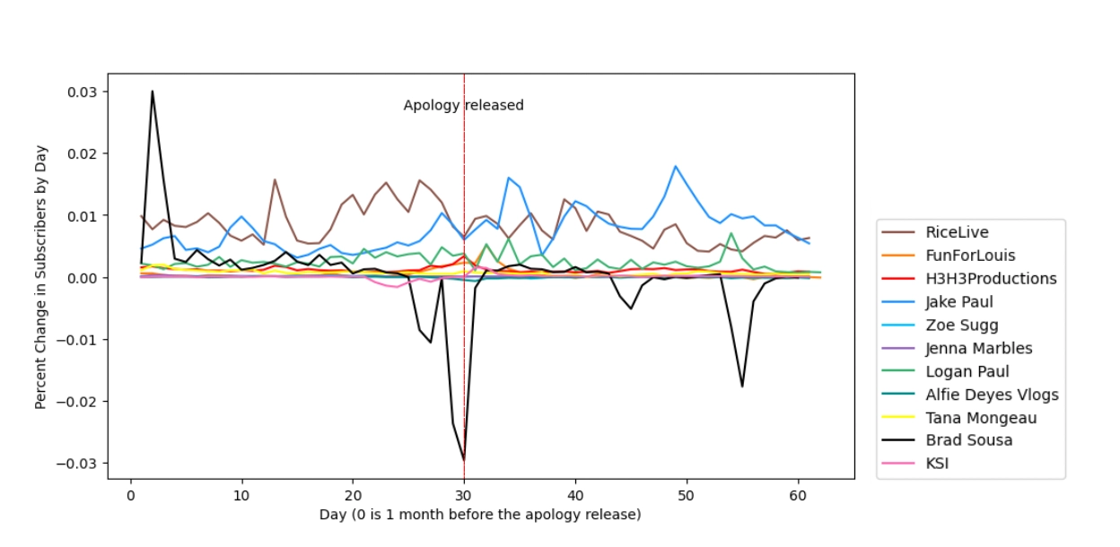 After choosing a number of case studies to focus on, we would delve deeper into the context surrounding the YouTuber's apology, social media metrics, and subsequent reception by their audience. We also planned on performing sentiment analysis on the comments of the apology videos through Python.