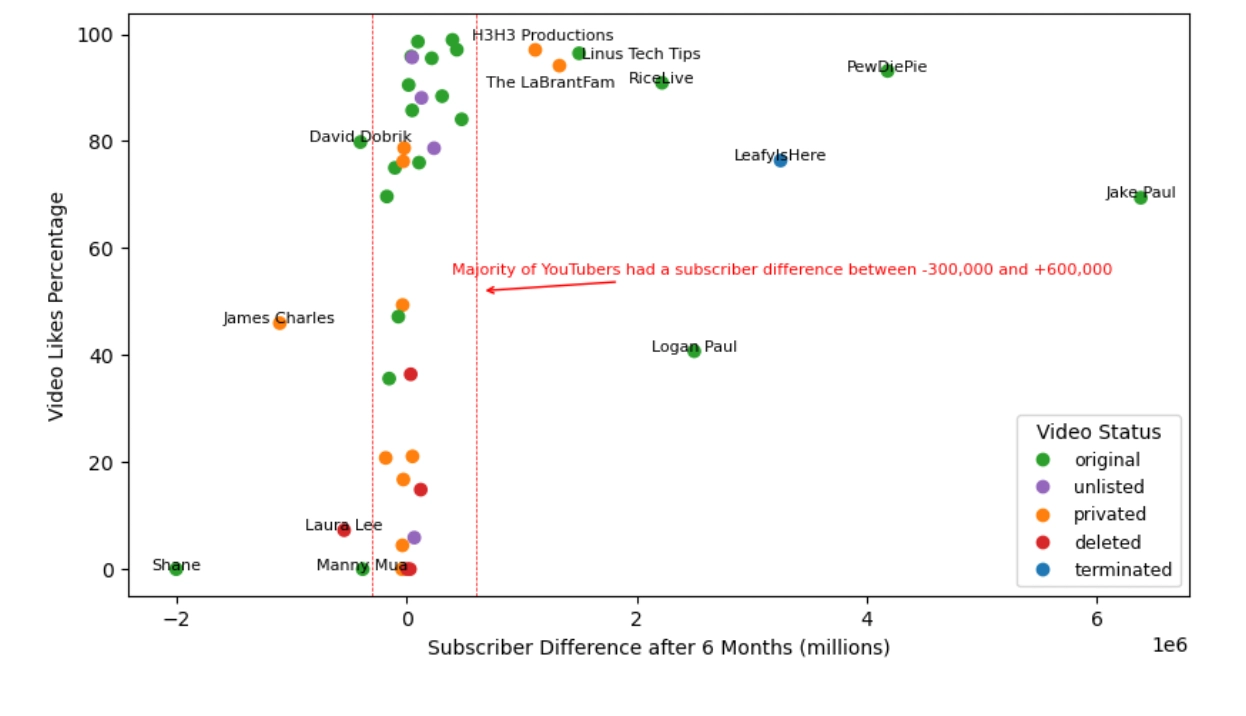 The majority of the YouTubers fell between the range of losing 300,0000 subscribers to gaining 600,000 subscribers six months after the apology. There was, however, a significant difference in the apology date for subscriber changes outside of that range. Except Linus Tech Tips, all YouTubers who gained over a million subscribers six months after the apology posted their apologies before September 2019. Notably, both Jake Paul and PewDiePie posted their apologies in 2017 and were the most successful channels following their apology, gaining 6.4 million and 4.2 million subscribers, respectively. On the other hand, three of the five YouTubers who lost more than 300,000 subscribers, were posted after 2019. This could be attributed to the rise of cancel culture in 2019, where influencers would quickly become de-platformed by the online community if they made any mistakes that influencers from the past may have been able to get away with. An article from Business Insider published in September of 2019 detailed this rise in cancel culture, and how it quickly destroyed careers for influencers who were not prepared for it.23