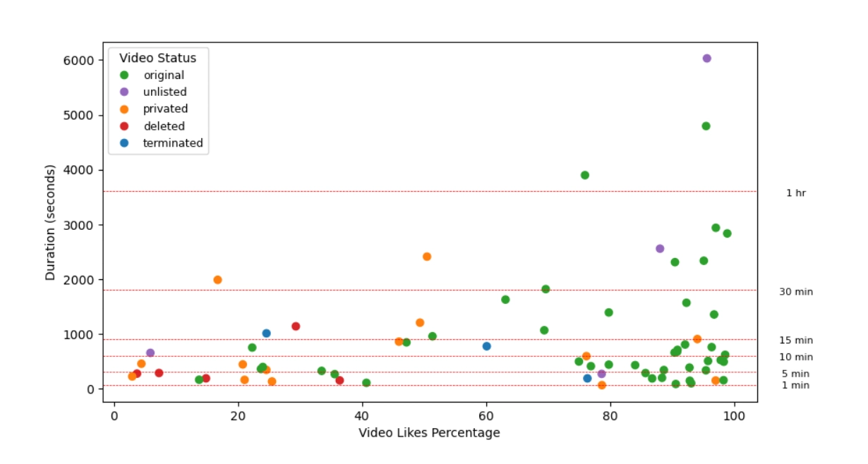 Unlike other projects that have analyzed YouTuber apologies, our dataset also includes videos that were unlisted, set to private, deleted or were from a channel that was terminated entirely by YouTube. Excluding this from any textual analysis would be as though they had never been made. Furthermore, the deletion of a video or otherwise changing its status could be a factor used in examining the authenticity of a YouTuber’s apology.