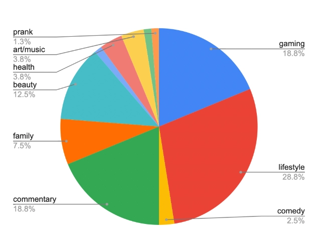 The types of YouTube channels behind the apologies we analyzed predominantly represented gaming, lifestyle, commentary, beauty, and family channels (see Figure 8). Different genres of YouTube channels attract specialized audiences so we anticipated trends would appear amongst specific audiences and apology reasons.