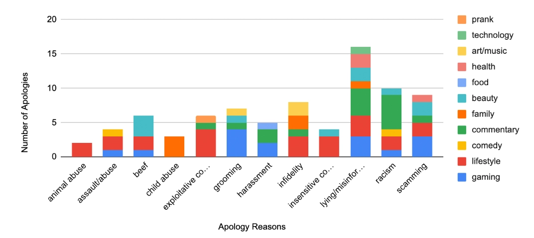 There were several trends in reasons for apologies for each channel type (see Figure 9). Apologies for animal abuse and child abuse were exclusively made by lifestyle and family channels, respectively. Lifestyle YouTubers apologized for nearly every reason available and made up most of the apologies for exploitative, infidelity, and insensitive content. Gaming channels were disproportionately represented in apologies for grooming and scamming, whereas commentary channels had a large presence in apologies for misinformation and racism.