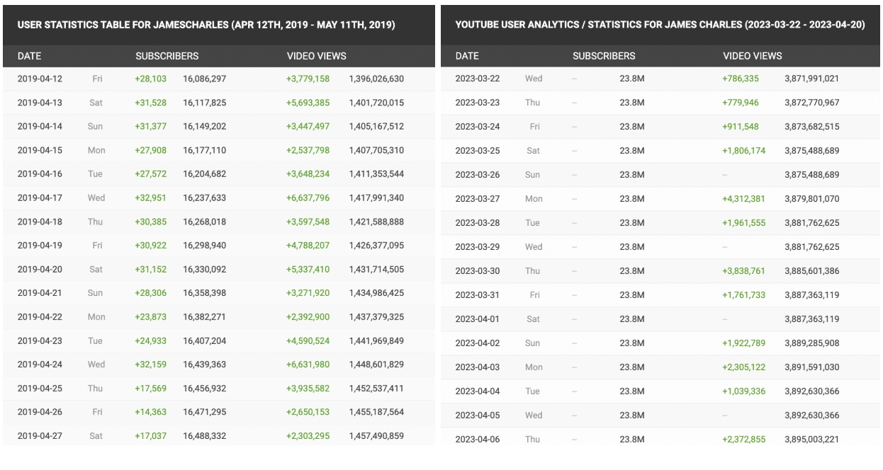 Social Blade is a site dedicated to tracking changes in social media engagement metrics. The curation of YouTube subscriber and viewership data largely depended on Social Blade, as the YouTube API could only gather current data.