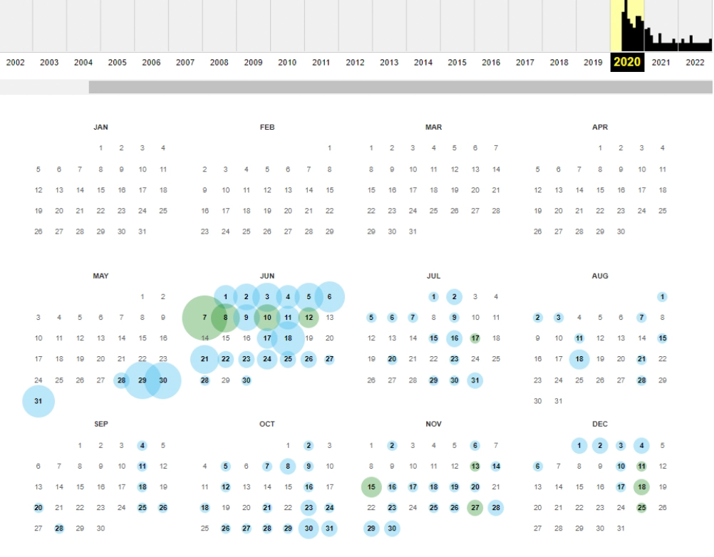 Kakkar, A., and Samora, R. “The Aftermath of a YouTube Apology.” The Pudding. January 2020. Data visualization. https://pudding.cool/2020/01/apology/.