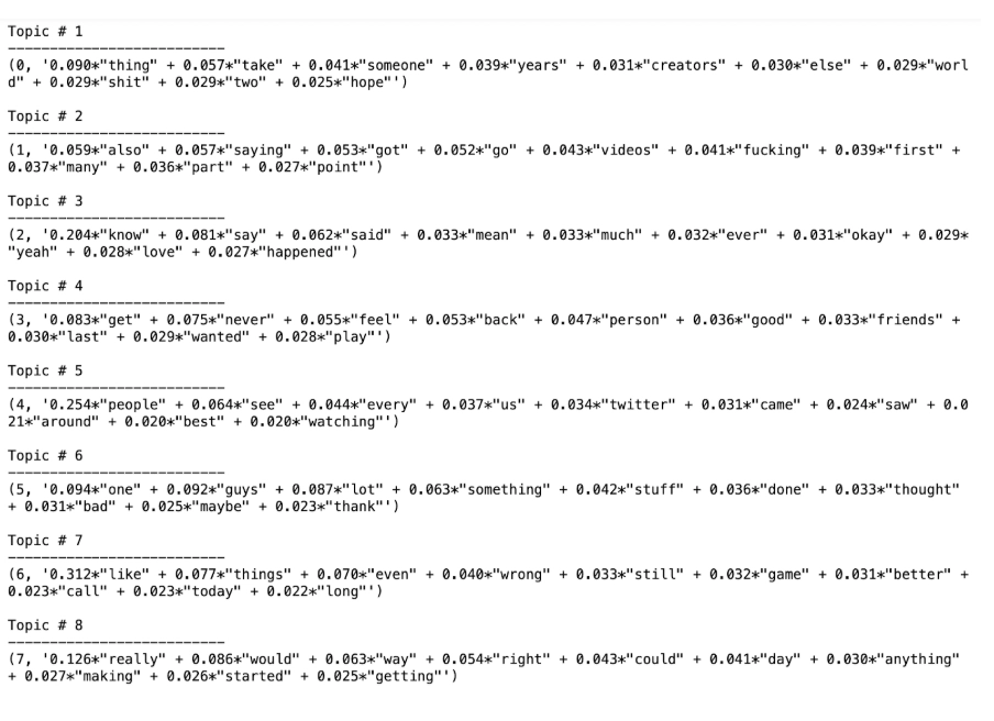 From these topics, very few contained apologetic words such as “sorry” or “wrong”. However, from certain groupings of words we can gain a bit of an idea of the subject of the video—for example, in topic 6, there is some indication of regret with the word “better” appearing alongside words such as “say” or “think”. The words “twitter” and “conversation” could mean that the influencer is responding to backlash on X (formally known as Twitter).