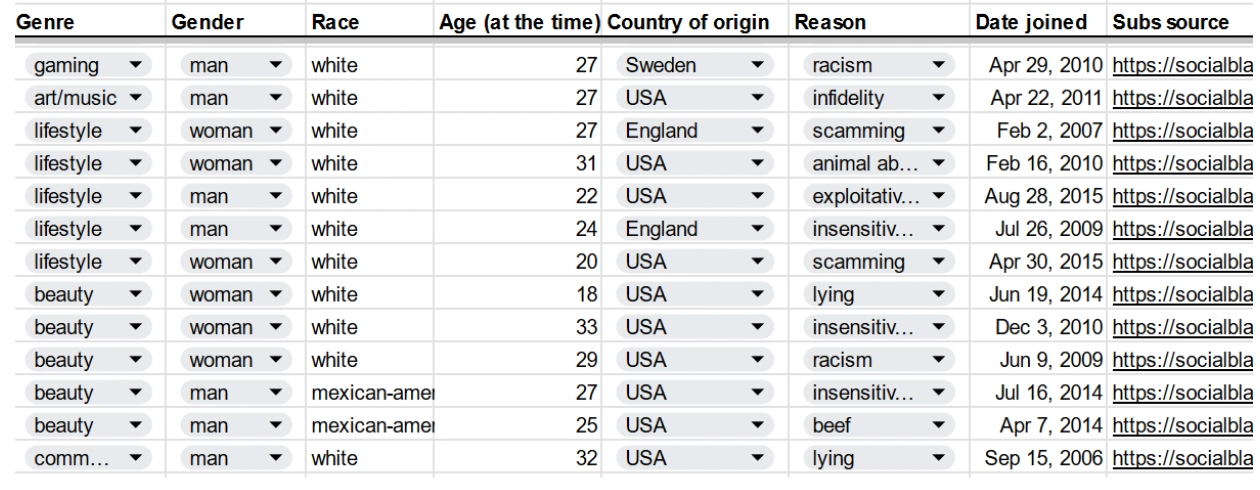 We thought that data on this topic would be readily available because influencers are public figures, and these apologies have become milestones in their careers. However, the information we found was scattered and incomplete.