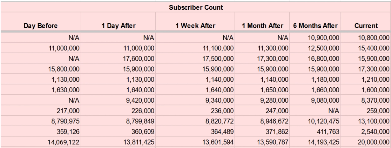 Current subscribers: All current subscriber counts were taken directly from Social Blade. Within a YouTuber’s page on Social Blade, those visiting the page can access a section labelled “Live Subscriber Count.” This provided a real-time subscriber count for any YouTube channel, which is updated every second. Even for channels that were terminated, the live subscriber count would show the subscriber count that they had before termination.